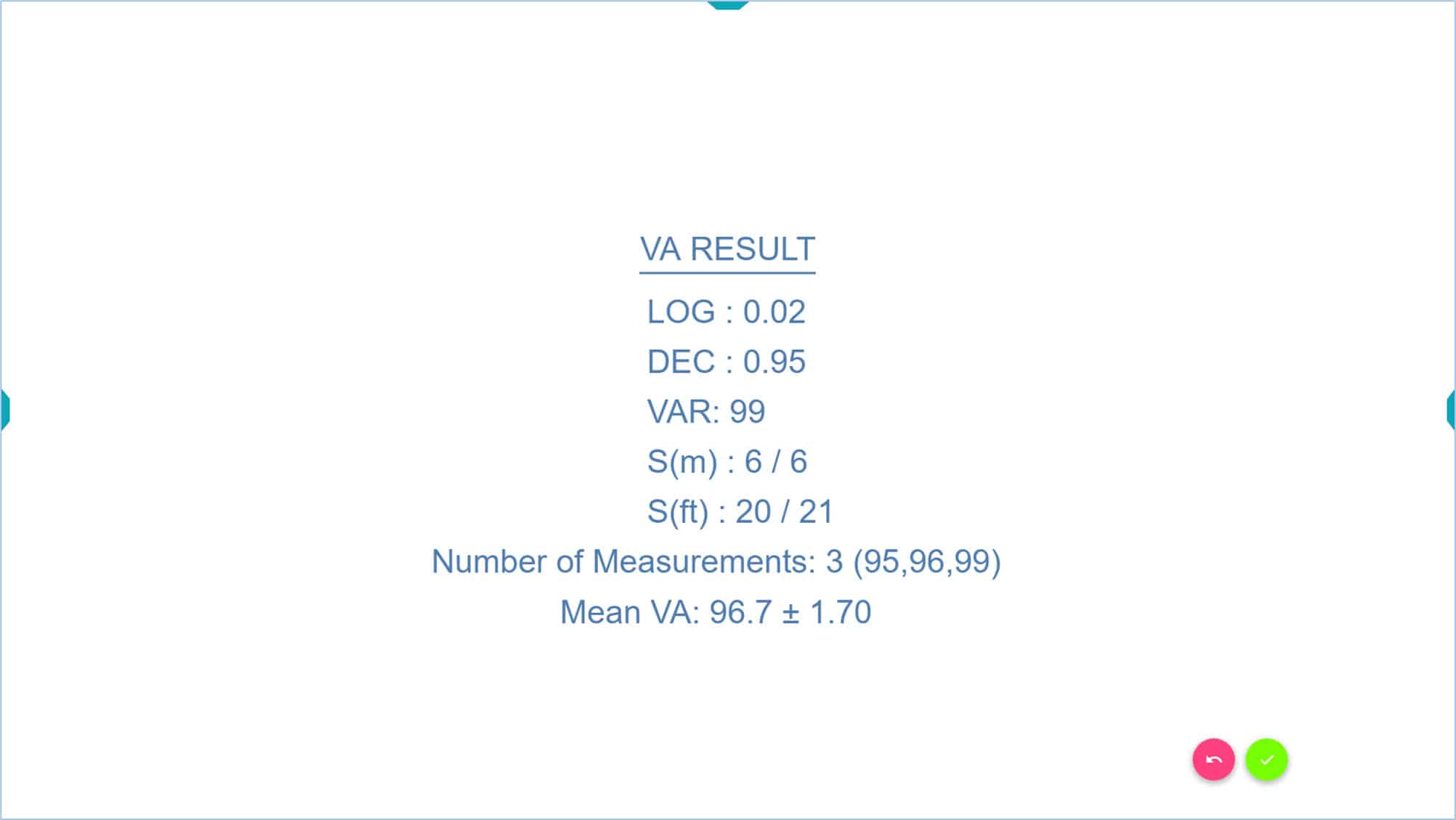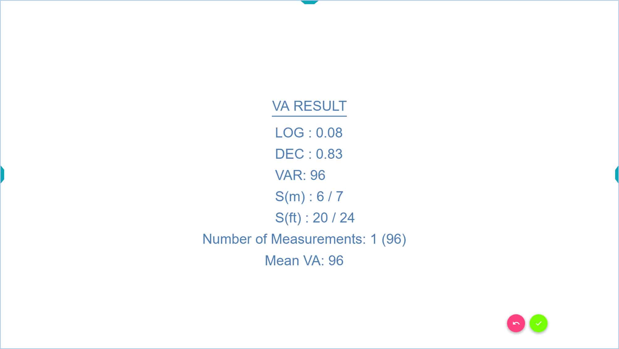 Suppose the patient misses all letters of the new row of 80 VAR, then the number “0” will be pressed. At this point the VA score results will be displayed in the five different notations: LogMAR, Decimal, VAR, Snellen (metric) and Snellen (imperial).