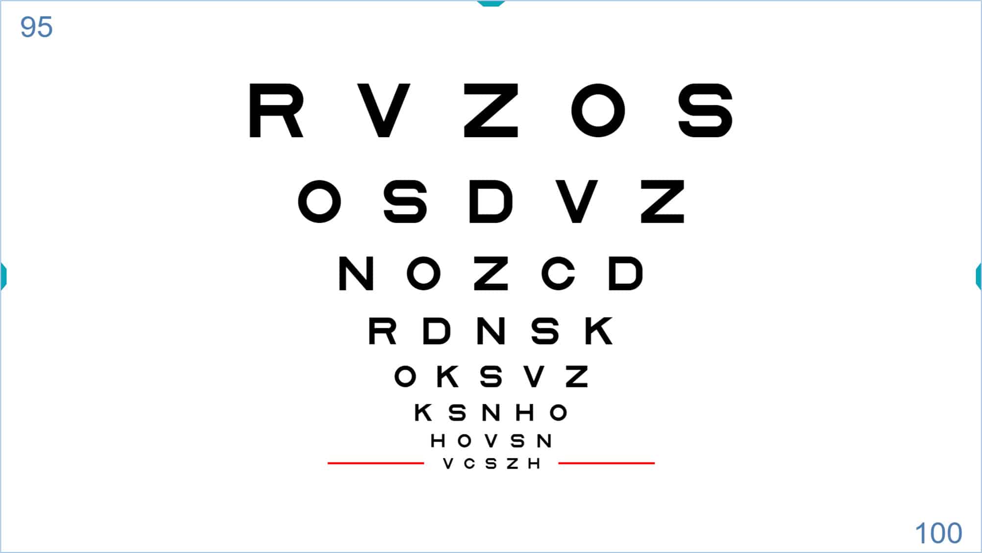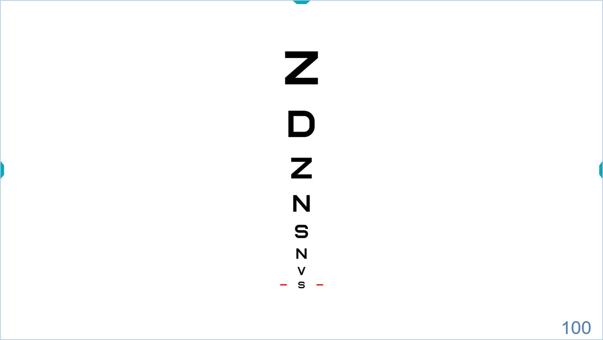 Once the patient makes the first mistake, the “T” key is pressed again (or ← arrow) to display the entire VA chart. The red lines will be shown either side of the row (in our example with a VA of 100 VAR):