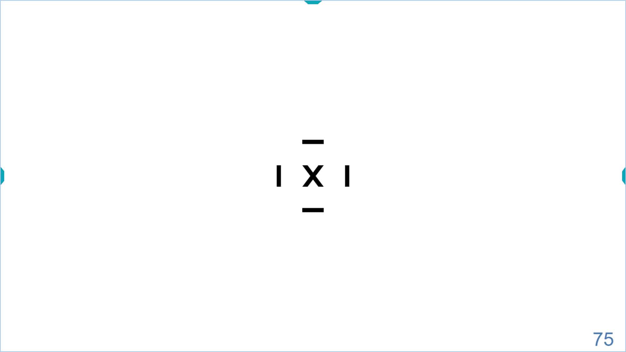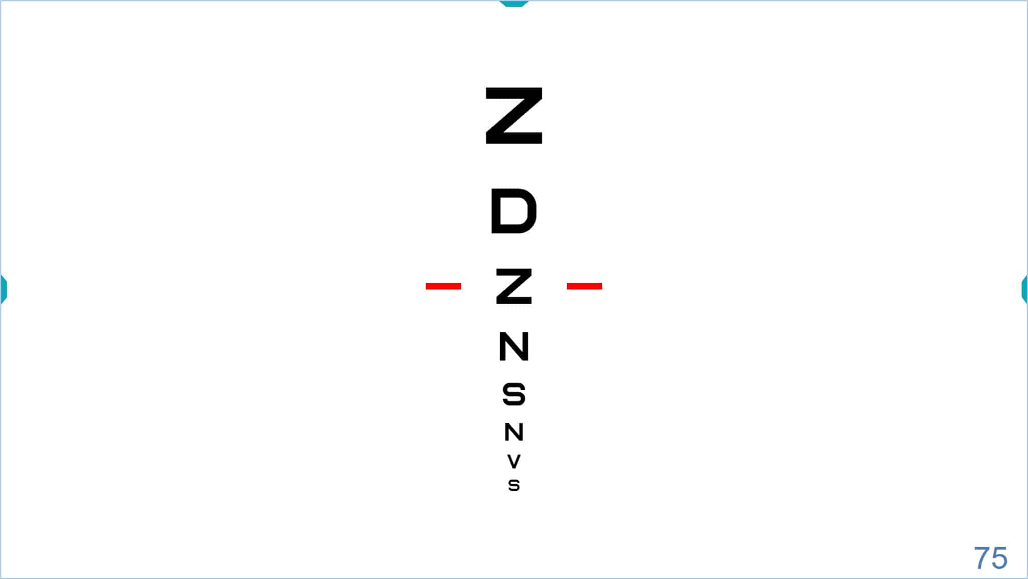 First, the patient is asked to read down isolated (single) letters binocularly (both eyes open) until a mistake is made. Let us assume that the first letter that the patient is unable to read correctly is the “X” which represents a VA of 75 VAR (Snellen 6/19, 20/63), as shown in the following figure (the VA value is shown in the lower right corner of the screen) (70 VAR can be recorded as binocular VA for single letters in this example).