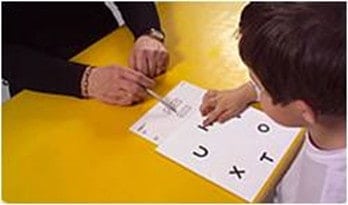 Prior to VA testing, training in letter matching is also recommended for younger children and for those unable or unwilling to name letters. The child is asked to identify and point to the same letters on a “matching keycard” that are shown on the computer screen, without having to name them. The matching key card consists of a sheet with printed symmetrical letters.