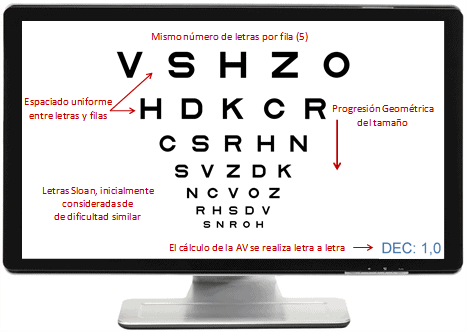 1. Igualdad en el número de letras (o símbolos) en cada fila: Todas las filas contienen siempre cinco letras o símbolos; salvo en agudezas bajas, cuando al ser muy grandes puede que no quepan en la pantalla que estemos utilizando. Así se puede valorar la AV en todos los niveles con el mismo grado de exactitud.