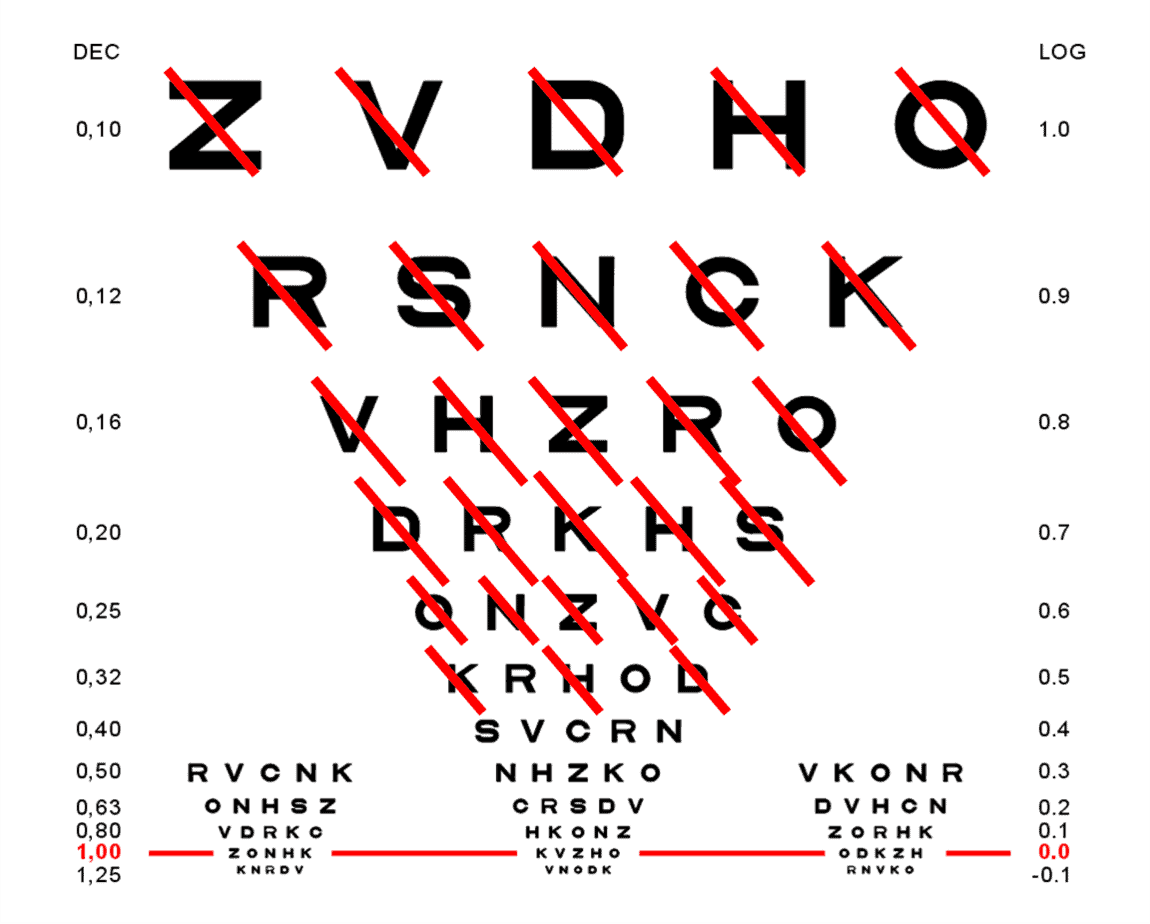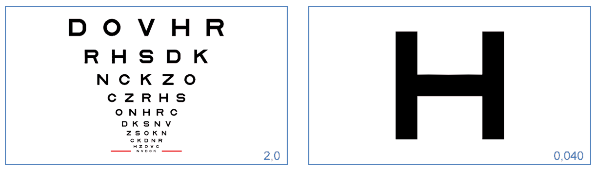 Utilizando el método descrito anteriormente, la AV logarítmica en este ejemplo es 0,88 log mientras que el índice de AV (IAV) es 56.