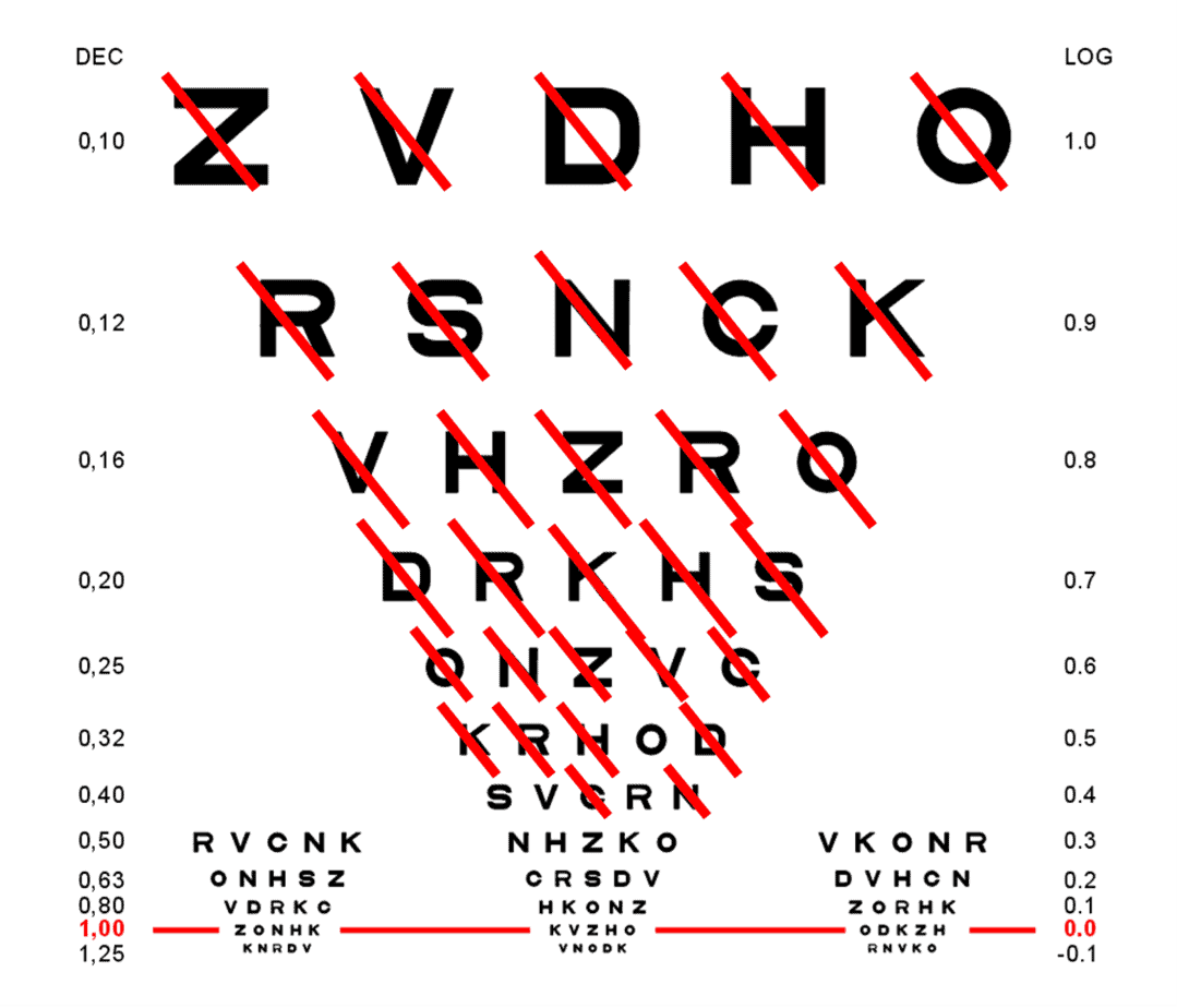 Por ejemplo, a continuación, se muestran tachadas las letras que un paciente ha identificado correctamente: