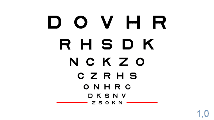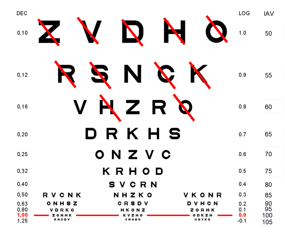 Con esta notación se le asigna un valor de “1” a cada letra, y vamos sumando el valor de todas las letras que ha conseguido identificar el paciente correctamente. Cada línea tiene cinco letras, por lo que suma 5 puntos si se ven todas. La AV 1,0 Decimal corresponde a un valor logarítmico de 0 (poco intuitivo) mientras que según la escala de IAV le corresponde una AV de 100 (mucho más intuitivo). Si este paciente leyera una letra de forma incorrecta, el valor de su AV sería de 99, si fallara 2 de 98 y así sucesivamente. Por otro lado, si leyera alguna letra más pequeña que la unidad, la puntuación pasaría a 101, 2 letras más a 102, etc.