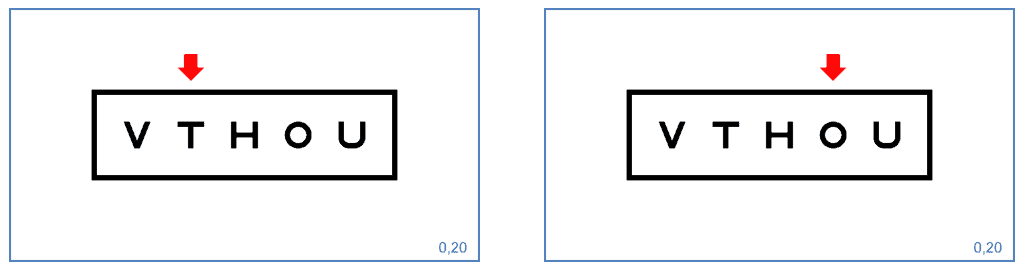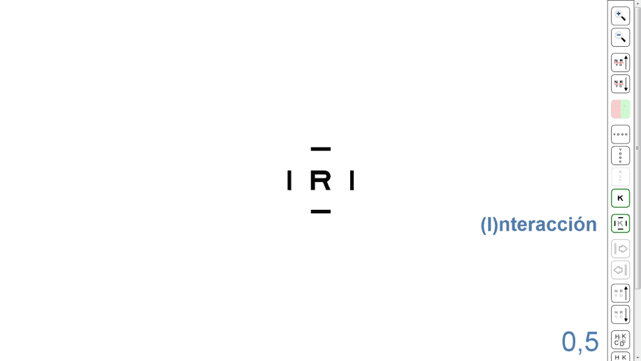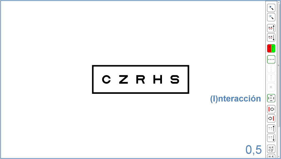 En estos casos conviene exhibir una única fila de letras, para que el niño no se pierda, pero con interacción de contornos, que permita detectar mejor la ambliopía. Para ello disponemos de un icono, que al pulsarlo muestra un rectángulo alrededor de la fila, cuyo trazo tiene el mismo grosor que el trazo de las letras o símbolos, y que está separado de las letras por una distancia que es igual a la altura* del tamaño de esas letras o símbolos. Los contornos aparecen también pulsando la tecla “I” [(I)nteracción].