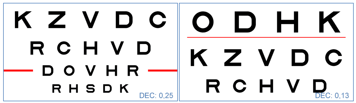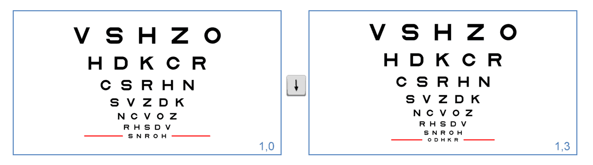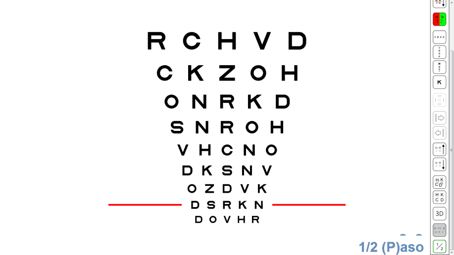 También podemos seleccionar las filas pulsando en las flechas del teclado arriba ↑ y abajo ↓, respectivamente. Al pulsar la flecha ↑ sucesivamente, la línea roja aparecerá en la parte inferior del optotipo e irá subiendo de nivel; mientras que al pulsar la flecha ↓, la línea aparece en la parte superior y va bajando a medida que pulsamos sucesivamente en la flecha.
