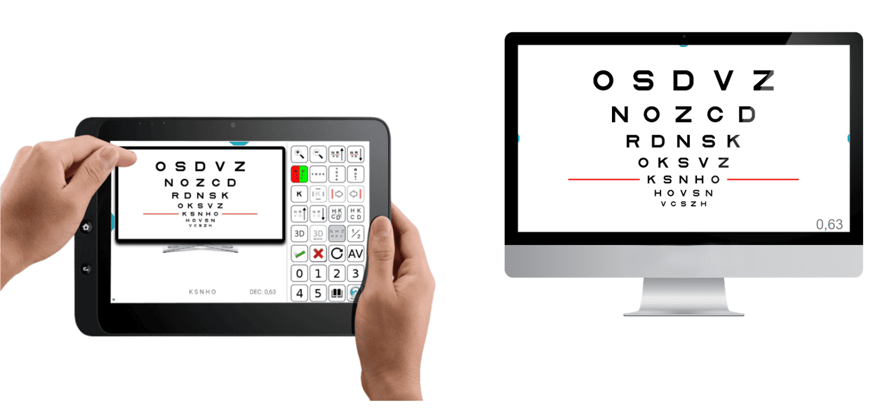 Vemos como la Tablet se convierte en un mando a distancia que muestra a la izquierda lo que ve el paciente en lejos, y a la derecha los botones con las opciones para este test. De esta forma, el profesional puede ver en la pantalla de la Tablet lo mismo que ve el paciente en la Unidad de visión, sin tener que girarse a mirar la pantalla de lejos.