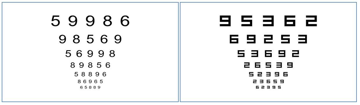 En este optotipo se utilizan solamente combinaciones de los siguientes 4 números: 8, 9, 6, 5, pues en el caso de que no se aprecien con nitidez, presentan una borrosidad similar. Los números son tipo Arial, con una proporción 5×4. El programa permite también utilizar números distintos para la AV, con una estructura cuadrada de 5×5, similares a la “E” de Snellen. En este caso los números son: 2, 3, 5, 6 y 9.