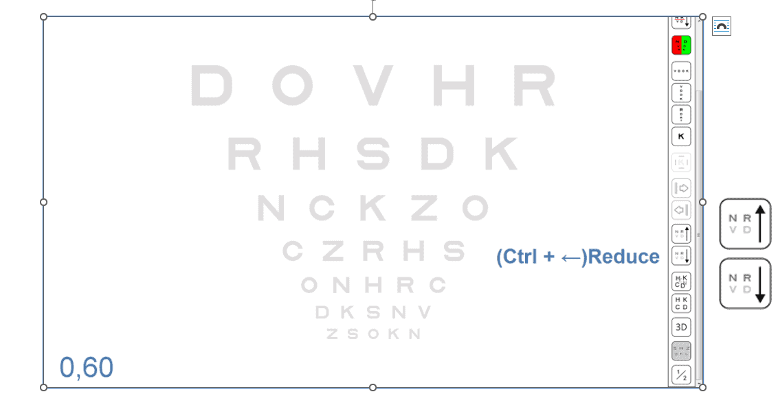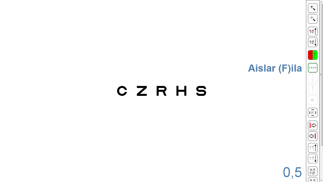 El menú incluye todos los iconos del menú de herramientas y además muestra en todo momento el valor actualizado de Agudeza Visual de la fila de letras aislada o seleccionada mediante las líneas rojas (AV de 0,63 Decimal en el ejemplo superior). También se muestran las letras que componen la fila seleccionada (K, S, N, H y O en nuestro ejemplo).