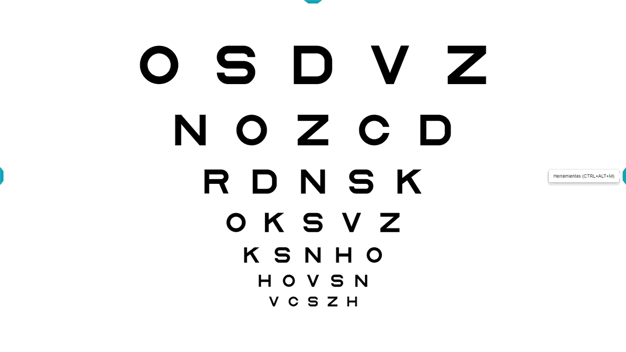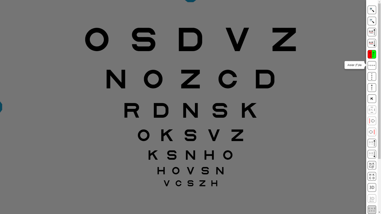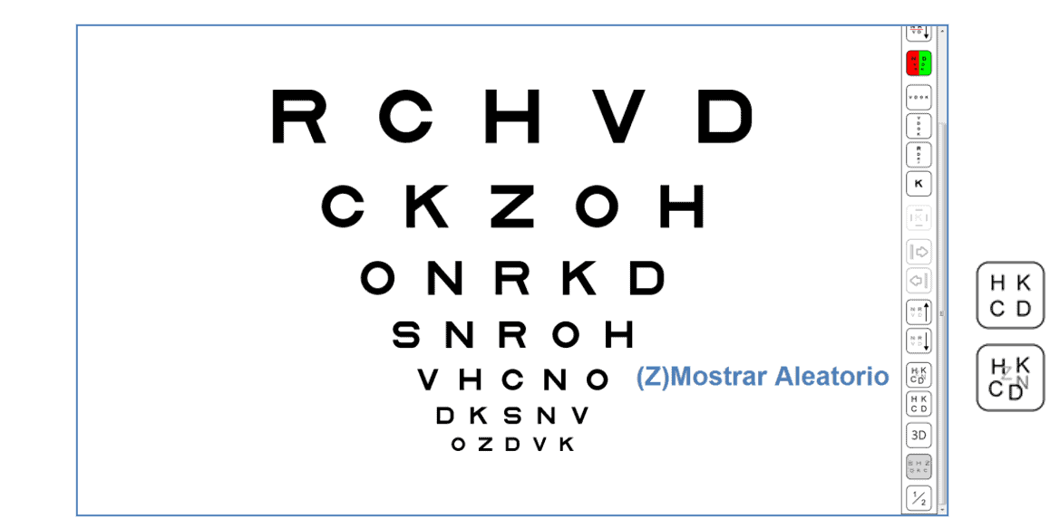 Los optotipos de AV se muestran siempre con la misma distribución de letras inicial. Sin embargo, para evitar que el paciente los memorice, podemos cambiar de forma aleatoria el orden y distribución de las letras, pulsando en el icono correspondiente del menú de herramientas o en la letra “Z” del teclado. Para volver a las letras iniciales tenemos otro icono, o pulsaremos en la letra “X”.