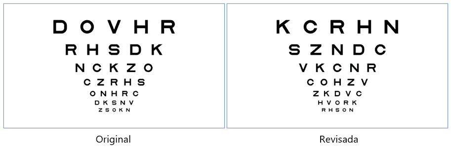 Con posterioridad, los propios autores revisaron la dificultad de las letras Sloan, pero esta vez en 7.420 ojos y con estos nuevos resultados ajustaron ligeramente la combinación de las letras Sloan en cada fila, dando lugar a la versión de optotipos ETDRS que denominaron “revisada”. (5) En teoría, estas nuevas combinaciones están ligeramente más equilibradas en cuanto a dificultad. El programa permite elegir entre la combinación de letras “original” o “revisada” a través de su menú de configuración.