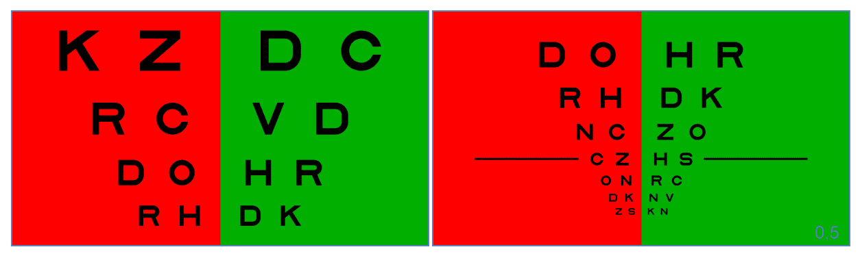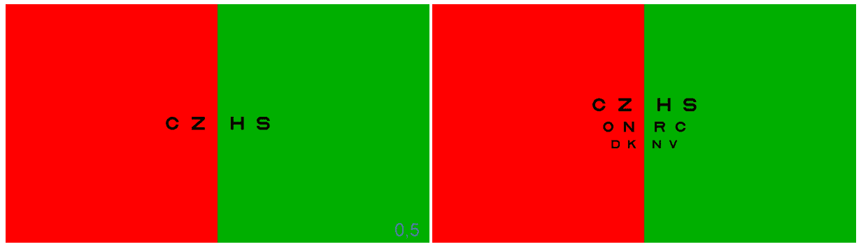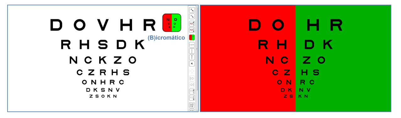 En todos los optotipos de AV es posible cambiar el fondo, dejando una mitad en rojo y la otra verde, para realizar la prueba del bicromático. Esta máscara de bicromático se activa pulsando en el botón del menú de herramientas, o directamente en la letra “B” del teclado [(B)icromático]. Al activar la opción de bicromático, las dos primeras letras de cada fila se muestran en fondo rojo, las dos finales en fondo verde y se elimina la columna central.