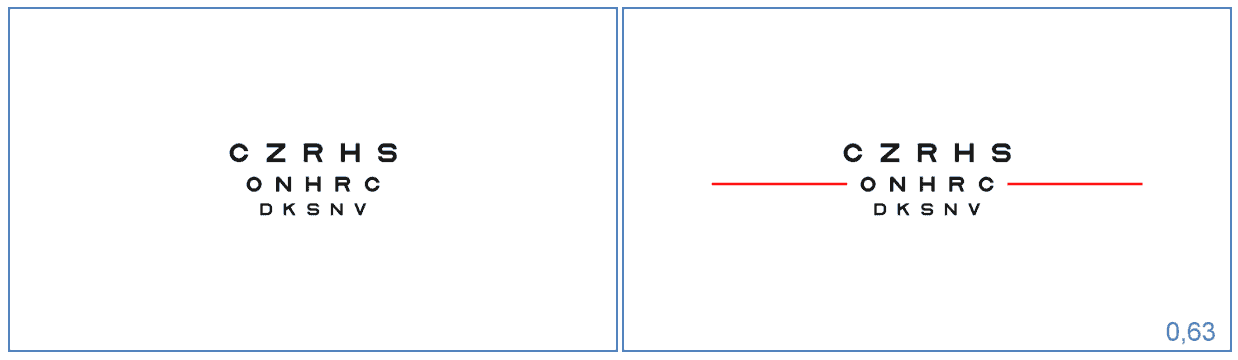 Pero en general, a la hora de determinar la AV, no conviene aislar las letras o filas, pues esto reduce la interacción de contornos mejorando la AV, lo que dificulta la comparación de resultados con otras visitas o profesionales. Además, conviene siempre animar al paciente a que intente adivinar las letras cuando está cerca de su umbral de AV.