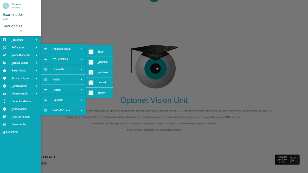 La Unidad de visión permite una gran versatilidad en sus tests. Para ello, cada optotipo de AV dispone de un menú de herramientas, que está a la derecha. Este menú está oculto y sólo aparece cuando pulsamos con el ratón en su pestaña, o deslizamos de derecha a izquierda con el ratón (o con el dedo en las pantallas táctiles). También se activa al pulsar la combinación de letras: Ctrl + Alt + M.