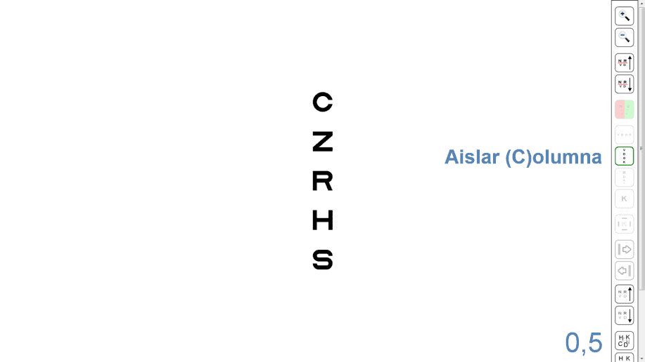 El programa permite aislar una columna de letras del mismo tamaño, pulsando en su icono del menú de herramientas, o en la letra “C” del teclado [(C)olumna]. En primer lugar, se muestra una columna de AV 0,5 decimal (el valor de la AV figura en la esquina inferior derecha de la pantalla).
