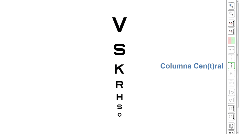 Por último, se ofrece también la posibilidad de aislar la columna central del optotipo de AV, en la que se muestran los caracteres en tamaño decreciente. Para acceder a esta nueva columna es necesario pulsar en el icono correspondiente, o en la tecla “T” del teclado [Columna Cen(t)ral], o en la flecha ← desde el optotipo completo de AV.