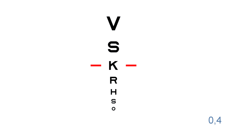El paciente vio todas las letras de la línea 0,6 log y tres letras de la siguiente fila (K, H y D). Por tanto, al valor de 0,6 le restaremos 0,02 por cada letra acertada de la siguiente fila (0,5) y así llegamos a la conclusión de que su AV es de: 0,6 – 0,06 = 0,54 log.