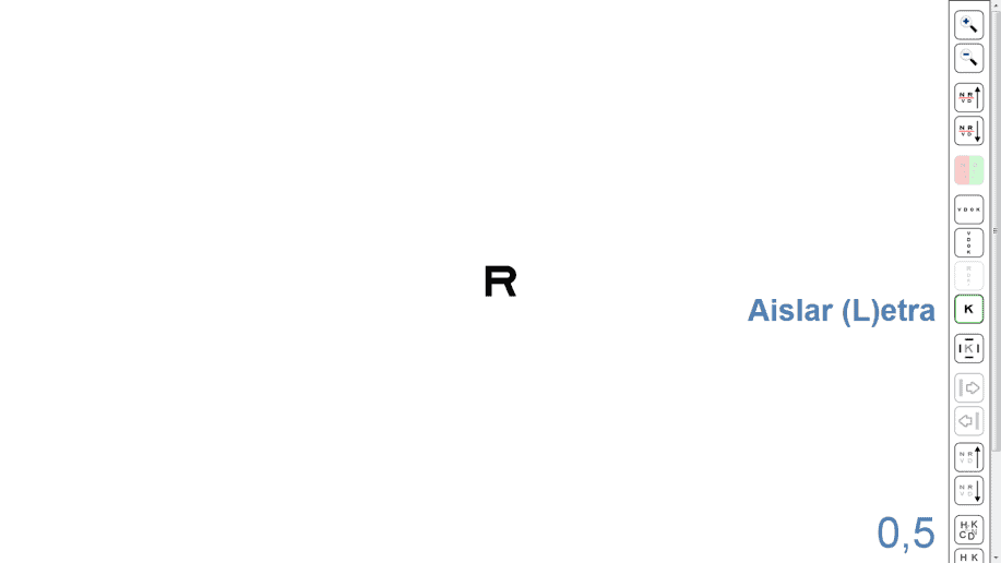 El primer optotipo que se muestra tiene una AV de 0,5 Dec (su valor se muestra en la esquina inferior derecha de la pantalla). Nuevamente, el tamaño del optotipo aislado se puede modificar pulsando con los iconos correspondientes, con los signos “+” y “-” del teclado, o con las flechas arriba ↑ (aumenta) y abajo ↓ (disminuye). Para volver a la pantalla inicial, con varias filas de letras, tenemos que volver a presionar en el icono de letra aislada, o en la letra “L” del teclado, o la flecha →.