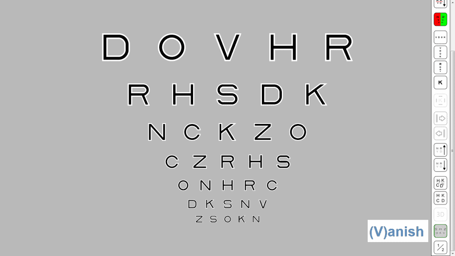 Los optotipos Vanish están formados por un trazo negro central, rodeado de un borde blanco a cada lado de la mitad de grosor. Las letras así creadas se muestran delante de un fondo gris, de forma que la luminancia media de la letra es idéntica a la luminancia del fondo. De esta manera, cuando una letra se ve borrosa se pierde en el fondo gris – desaparece – y de ahí su nombre de “Vanishing Optotypes” u “Optotipos Fantasma”.