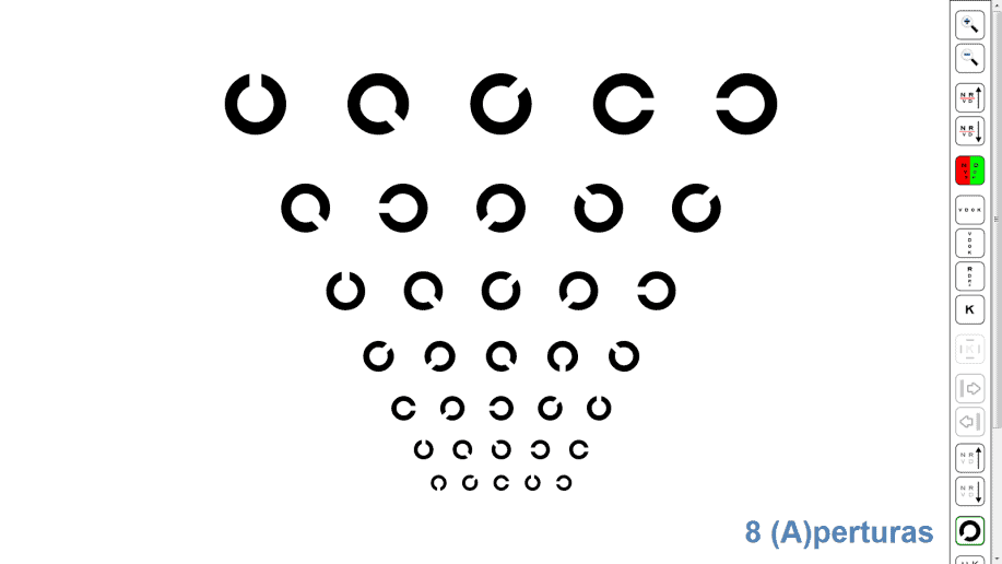 Pulsando en un icono del menú de herramientas (o en la tecla A) es posible mostrar 8 posiciones distintas, al añadir las posiciones en las que la apertura está orientada en las 3 diagonales restantes, 135, 225 y 315º, con el objetivo de cumplir con el estándar ISO 8596, que recomienda utilizar las 8 orientaciones para la medida de la AV con la “C” de Landolt.