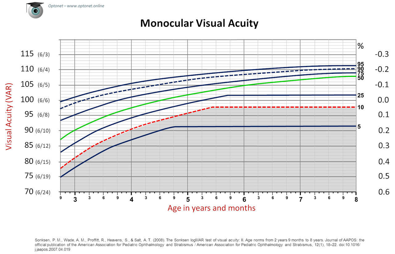 3. Sonksen, P. M., Wade, A. M., Proffitt, R., Heavens, S. & Salt, A. T. The Sonksen logMAR test of visual acuity: II. Age norms from 2 years 9 months to 8 years. J. AAPOS Off. Publ. Am. Assoc. Pediatr. Ophthalmol. Strabismus Am. Assoc. Pediatr. Ophthalmol. Strabismus 12, 18–22 (2008).