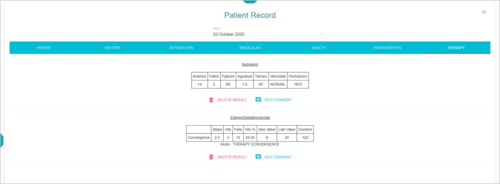 The Vision Unit allows exporting all the results of a specific visual therapy exercise performed by the patient to PDF format. This way, we can assess their progress more quickly.