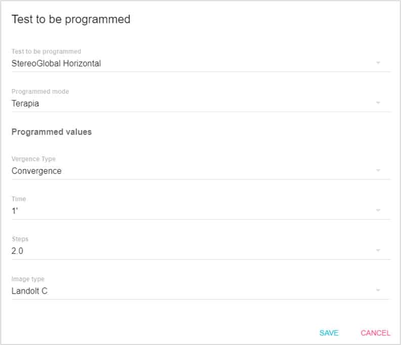We select Day 1, click on Add Programmed Test, then on the Horizontal Stereo-Global Vergences test. A menu will then open, where we can establish the following parameters: